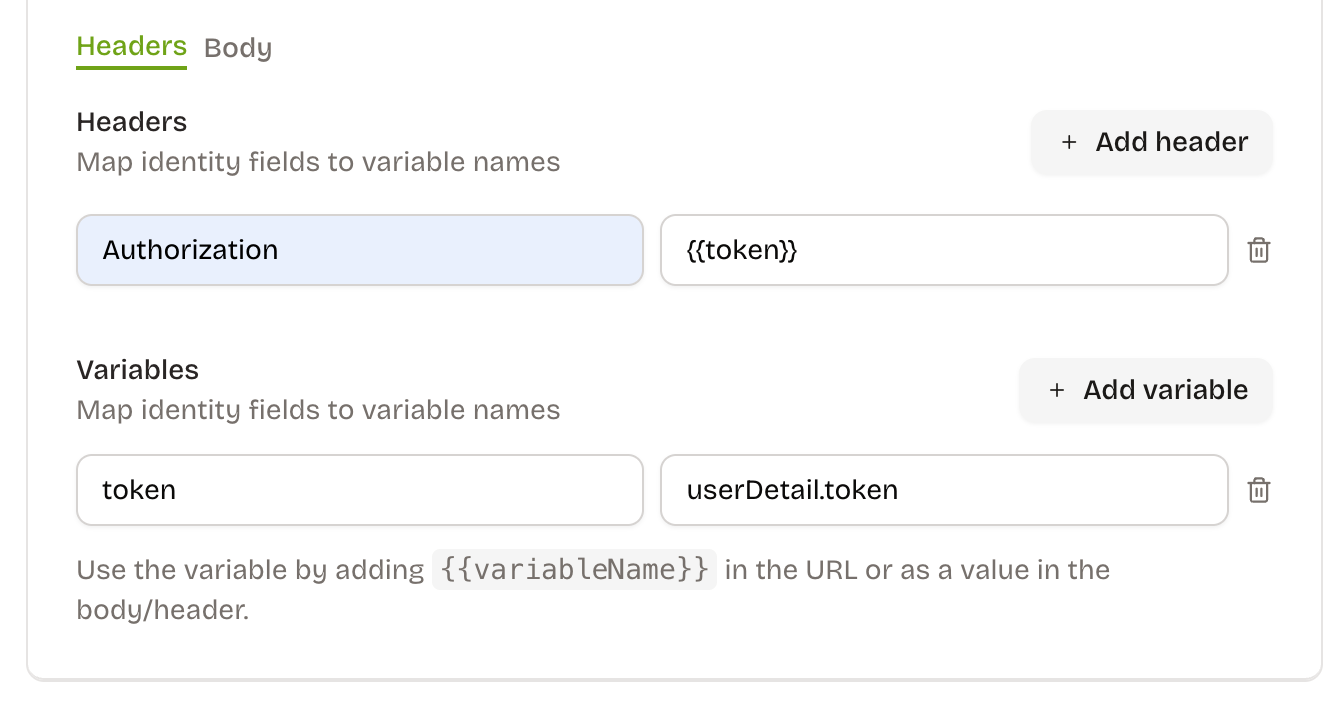userDetail.*to friendly names (e.g.,token,userEmail). - Usage: reference variables in the URL, headers, or body with