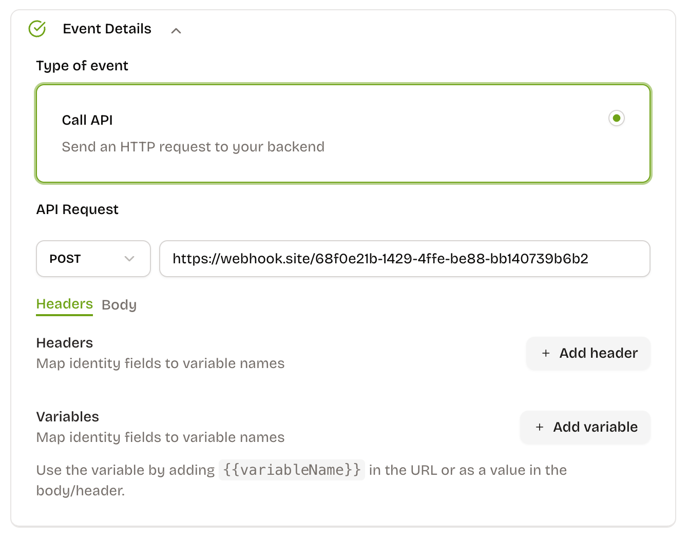 - Call API: Use when you want a one-click webhook (e.g., "Start trial"). Configure method, URL, headers/body, and any